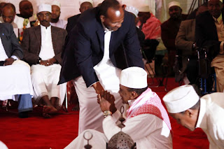 | His Excellency President Uhuru Kenyatta (Hugging, facing camera) in Islamic attire, Looking on is Kenya's Majority Leader, Aden Duale |